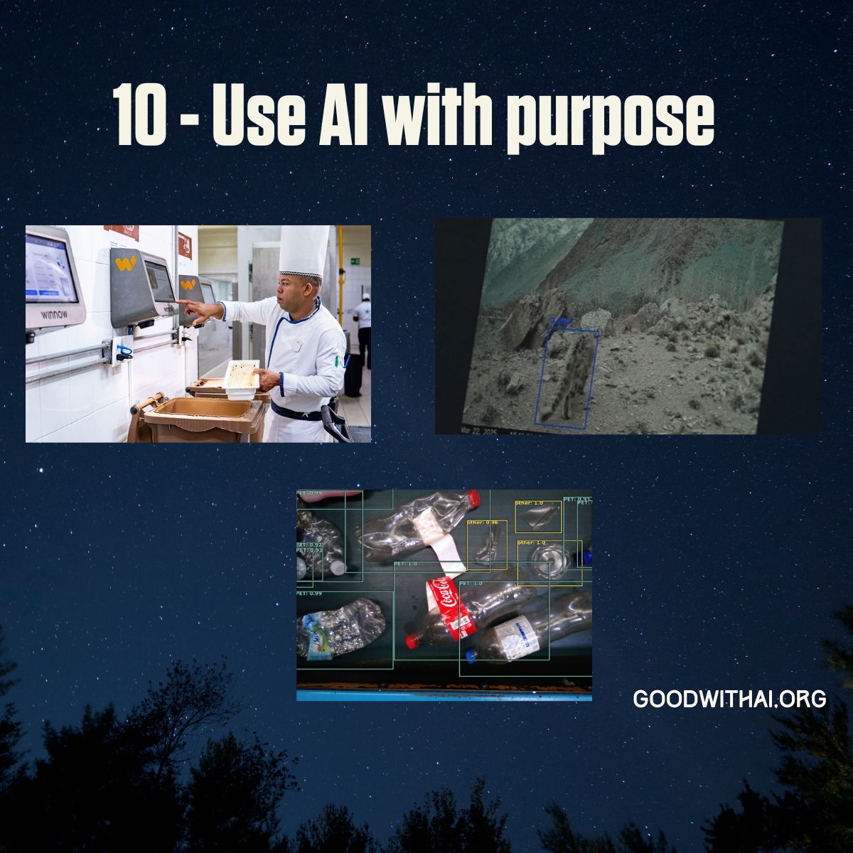 Last in our top 10 but the most important. We started exploring AI because we could see its potential upsides for impact and empowerment - as well as the downsides. After a year going deeper into teaching it, we stand by this. Ultimately, the real impact happens, not simply by using AI but WHAT we use AI for. There are so many great examples already - pictured: Winnow (food waste), tracking Snow Leopards in Pakistan and Grey Parrot (smart recycling). We'll keep sharing them.